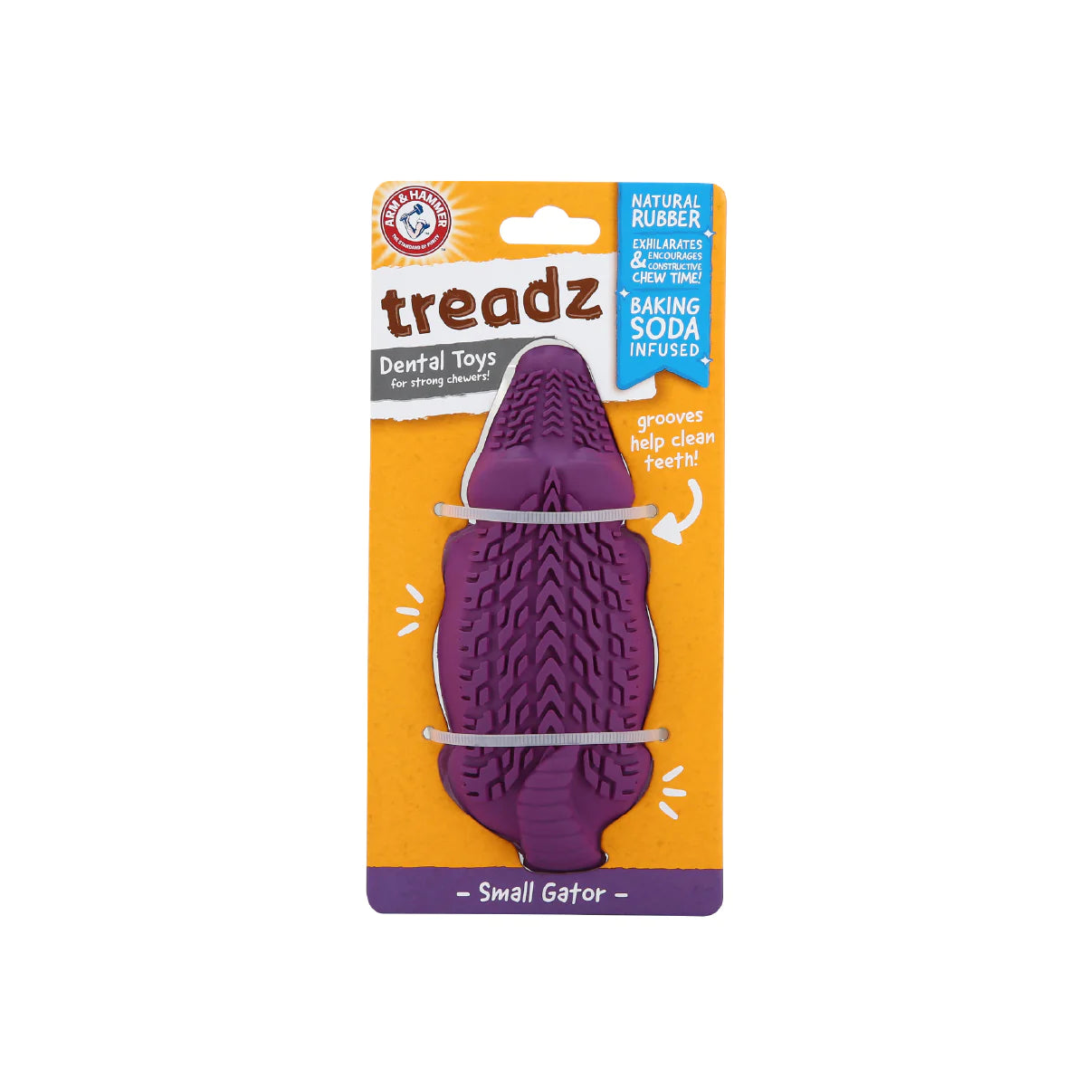 El juguete masticable dental Arm & Hammer Super Treadz Mini Cocodrilo, está diseñado específicamente para redirigir la masticación destructiva de tu mascota a un tiempo de juego positivo, elaborado con lo último en tecnología de cuidado dental duradero para perros. Su cuerpo de caucho natural infundido con bicarbonato de sodio no solo ayuda a limpiar y refrescar los dientes de tu mascota, sino que también ayuda a estimular las encías y reducir la acumulación de sarro y placa. Además, gracias al cuerpo extremadamente duradero ¡Resiste hasta a los masticadores más agresivos! ¡Cuida la salud dental de tu perro mientras se divierte!