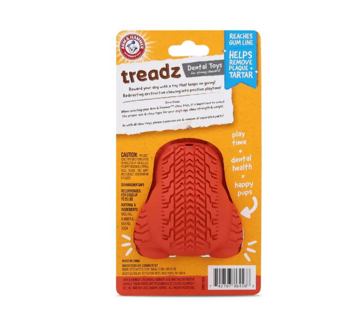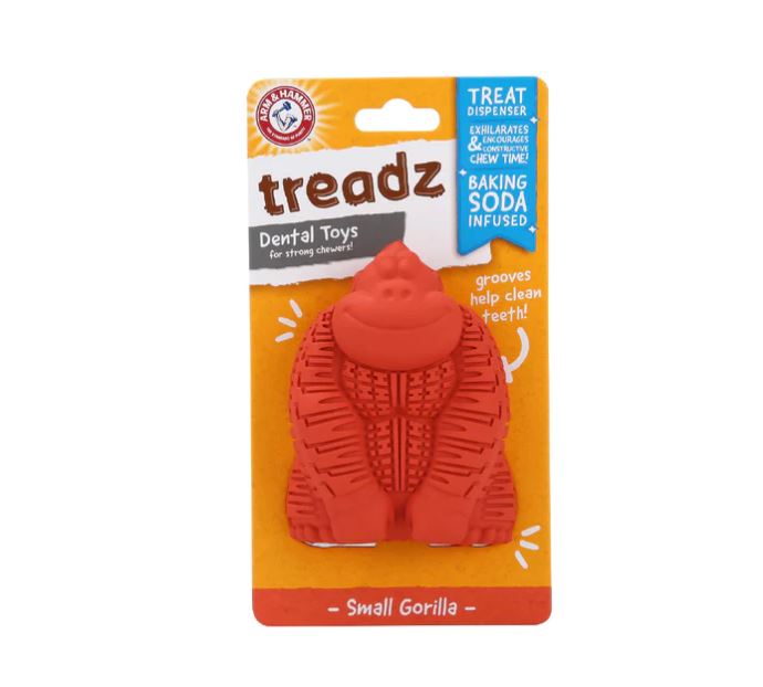 El juguete masticable dental Arm & Hammer Super Treadz Mini Gorilla, está diseñado específicamente para redirigir la masticación destructiva de tu mascota a un tiempo de juego positivo, elaborado con lo último en tecnología de cuidado dental duradero para perros. Su cuerpo de caucho natural infundido con bicarbonato de sodio no solo ayuda a limpiar y refrescar los dientes de tu mascota, sino que también ayuda a estimular las encías y reducir la acumulación de sarro y placa. Además, gracias al cuerpo extremadamente duradero ¡Resiste hasta a los masticadores más agresivos! ¡Cuida la salud dental de tu perro mientras se divierte!
